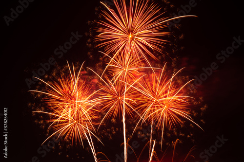 Abstract and brightly colorful firework with free space in the celebration and anniversary festival.Merry Christmas and New year party light over night sky.