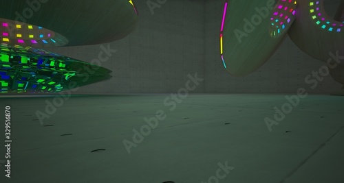Abstract architectural background. Interior made of wood, concrete and glass. Colored neon lighting. 3D illustration and rendering.