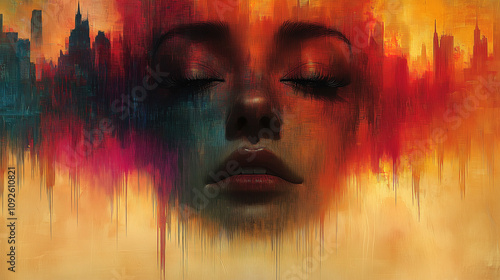 Abstract art depicting a serene face blending with a vibrant city skyline in warm hues during sunset. Generative AI