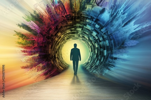 abstract, artistic, visionary, light, colours, portal, mystical, illusion, journey, solitude, silhouette, landscape, vibrant, imagination, escape, inspiration, emotion, pathway, surreal, life events, exploration, transformation, creativity, futuristic, meditative, depth, energy, dynamic, movement, dreamlike, philosophical, universe, conceptual, symbolism, balance, harmony, mindfulness, colourful, artwork, design, interpretation, thought provoking, expressive