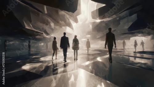 people, walking, perspective, abstract, geometric, structure, futuristic, light, shadow, figure, silhouette, space, architecture, design, art, digital, illustration, dark, bright, modern, pathway, journey, travel, explore, interior, conceptual, dramatic, vision, direction, destination, forward, together, oneness, team, building, environment, atmosphere, render, concept, path, progress, collective, unknown, urban, style, fantasy, imagination, dream