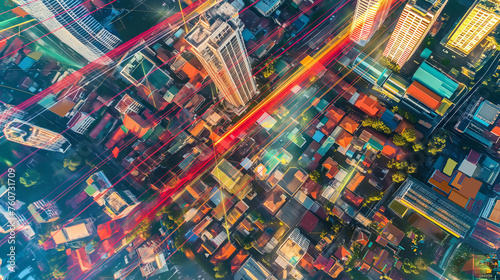 Abstract background Arial view of the city and there are laser beam of streaking up into the sky