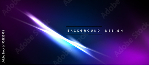 Abstract background features vibrant purple, blue gradients. Bright light streaks diagonally cross dark space. Text reads background design.