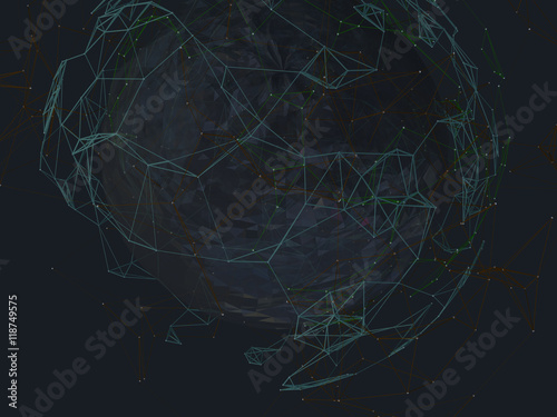 Abstract background lines, connected dots and geometric shapes. 3D illustration.