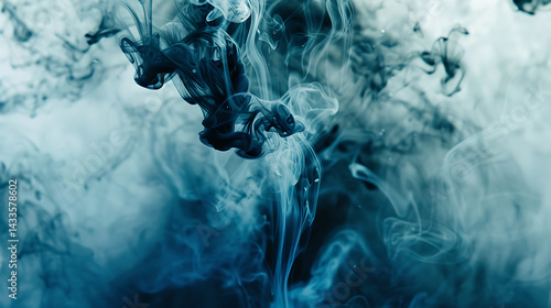 Abstract background of dark blue or black ink swirling and diffusing like smoke clouds in lighter blue or white liquid. Moody, fluid motion texture.