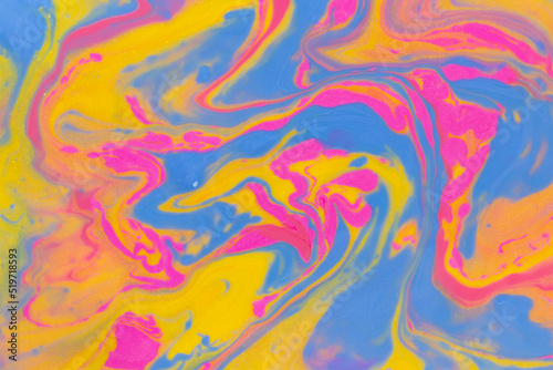 Abstract background of mixed shades of nail polish with a shiny marble pattern. Liquid colorful paint background creative yellow and pink with shimmer and blue