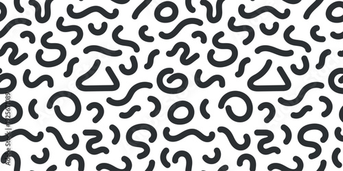 Abstract background. Shapes, lines, swirls, circles. Seamless black and white pattern, vector texture.