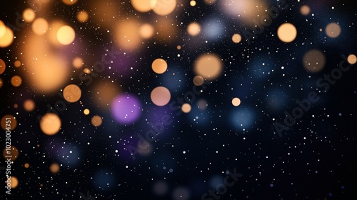Abstract background with colorful bokeh lights and soft focus particles on a dark backdrop, creating a festive and dreamy atmosphere suitable for celebrations and events.