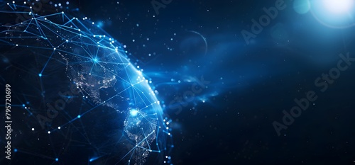 Abstract background with global network concept and digital connection technology in space, data transfer from one planet to another on dark blue abstract backdrop with light effect, copy spase