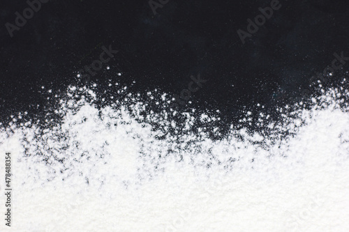 Abstract baking background with copy space on a black surface for text. Spot on black, top view on the board. The concept of baking, the preparation of dough or dough.