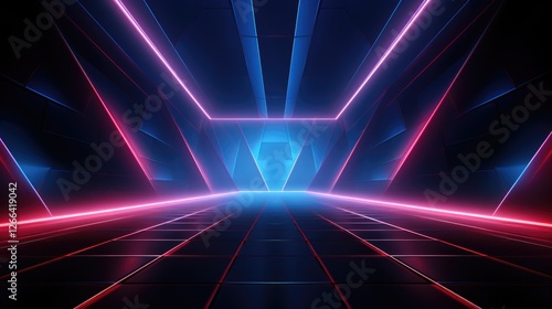 Abstract beautiful neon background with glowing lines, empty room interior design. Abstract geometric shapes, blue and red lights in a dark space