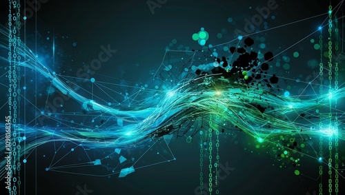 Abstract Big Data Visualization with Flowing Binary Code, Glowing Geometric Shapes, and Digital Particles in Electric Blue and Green on a Black Background