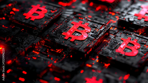 Abstract Bitcoin Symbols on Textured Dark Background with Red Glow Represents Digital Currency in a Futuristic Style