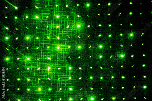 Abstract black digital technology background with green luminous particles dots. Matrix of virtual reality. Computer binary code illustration.