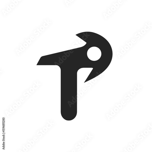 Abstract black logo design featuring a stylized letter "T" intersecting with a curved shape containing a circular cutout, on a white background.