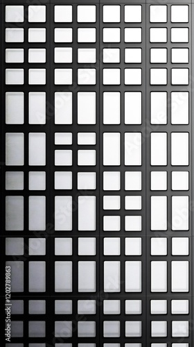 grid, pattern, design, geometric, abstract, black, white, rectangle, square, shape, monochrome, texture, background, modern, contemporary, minimalist, simple, clean, line, structure, architecture, industrial, metal, steel, perforated, mesh, screen, fence, panel, decorative, graphic, art, style, illustration, wallpaper, surface, repeat, overlay, element, template, motif, composition, visual, aesthetic, contrast, shade, form, arrangement