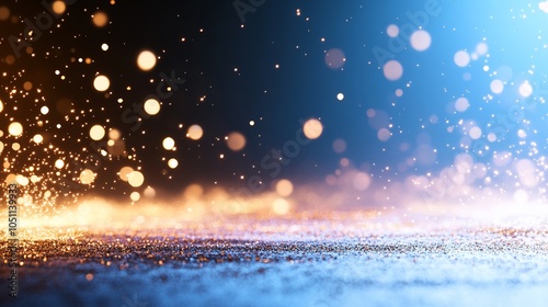 Abstract blue and gold bokeh background with glowing sparkles.