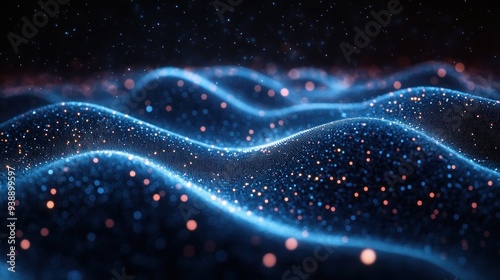 abstract, blue, wave, orange, glistering, light, sparkle, background, digital, art, design, texture, pattern, motion, dynamic, energy, futuristic, technology, space, cosmic, galaxy, glowing, shimmer, iridescent, particle, dot, blur, bokeh, dark, night, fantasy, dream, three-dimensional, render, graphic, illustration, contemporary