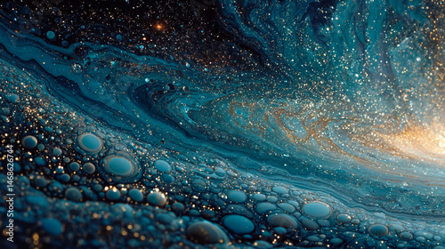 Abstract blue and white background with planets, stars, and bubbles in water against a dark sky.