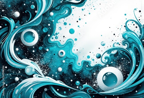 Abstract blue and white swirling wave design with bubbles and splashes for digital or print use