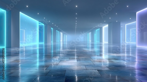 Abstract Blue Neon Cyber Tunnel Futuristic Background with Reflections and Geometric Shapes