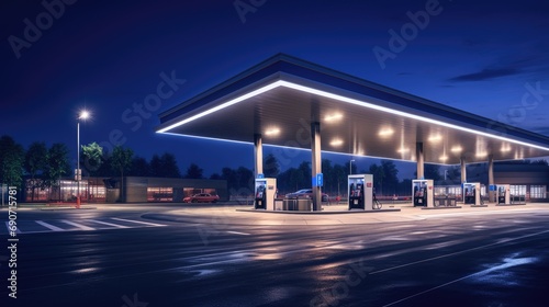 abstract, blurred gas station against a dark blue sky during evening twilight. Perfect for conveying the energy and motion of urban refueling.