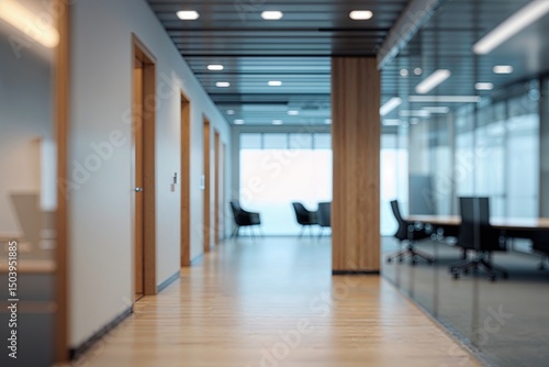 Abstract Blurred Office Hall Interior with Meeting Room and Defocused Corridor in Modern Workspace