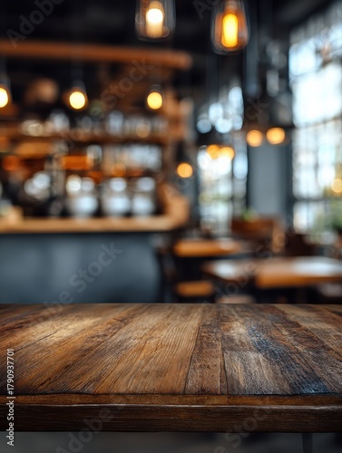 abstract blurry restaurant interior background with empty wooden table mock up no logos no brands ar 34