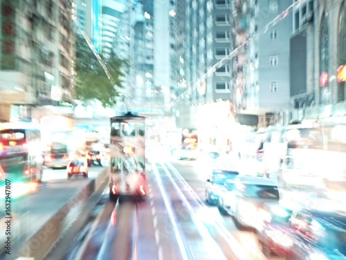 Abstract bokeh image of Hong Kong city street with trams and cars.