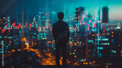 Abstract business man stands on the peak of success amid tall, innovative Smart city and graphs with statistics to analyze business potential and predict future developments in company growth.