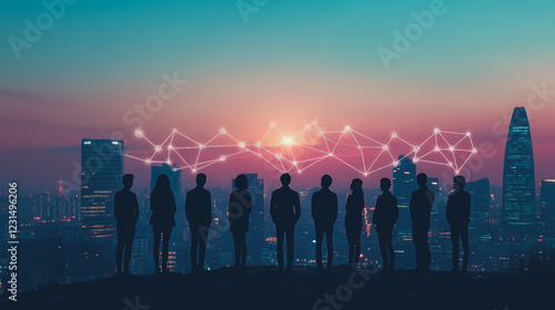 abstract, business, team, stand, peak, success, businessman, tall, innovative, modern, building, canvasses, potential, predict, future, company, growth, smart, digital, city, connection, network, reciprocity, city landscape, concept, wireless, social, media, connect, people, double, exposure, wave, background, artificial intelligence, thing, networking, night, silhouette, urban, skyline, building, architecture, illustration
