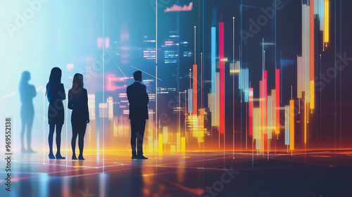 Abstract business team work stands on the peak of success amid tall, innovative Smart city and graphs with statistics to analyze business potential and predict future developments in company growth.