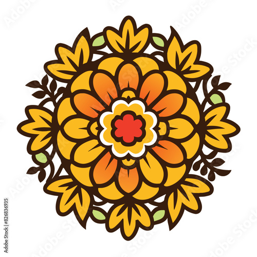 abstract, circular, floral, design, yellow, orange, red, white, brown, colours, pattern, ornament, mandala, decorative, symmetric, geometric, stylised, illustration, graphic, artwork, art, digital, shape, circle, flower, flower petals, leaf, center, detail, line, element, style, vibrant, colourful, intricate