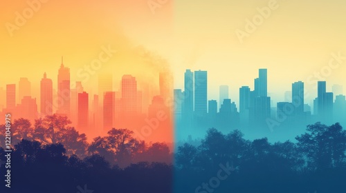 Abstract cityscape divided by a line of clear air and smog, highlighting pollution contrast, [air quality awareness], [haze concept].