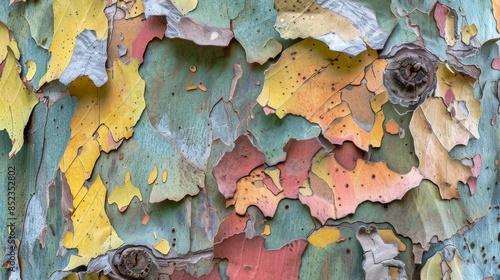 Abstract close-up of colorful, peeling bark with varied textures and hues.