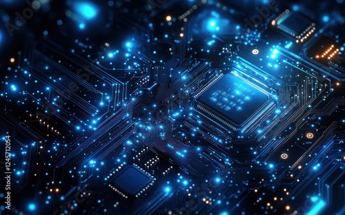 Abstract close-up view of a digital circuit board with blue glowing lights and intricate electronic components representing technology and innovation