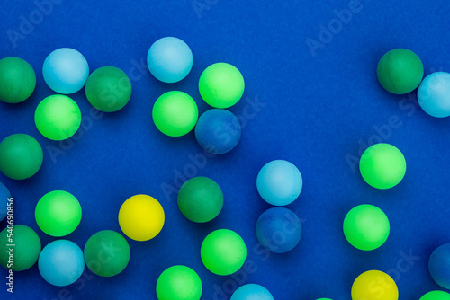 Abstract colored balls background. Multi-colored taw toy scattered on bright paper. Base for design nice backdrop, wallpaper, poster. Noisy surface texture