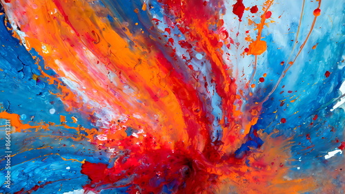 Abstract colorful paint splatter with blue, red, orange and white, resembling an explosion or eruption. Modern art concept for design, background, or wall art.