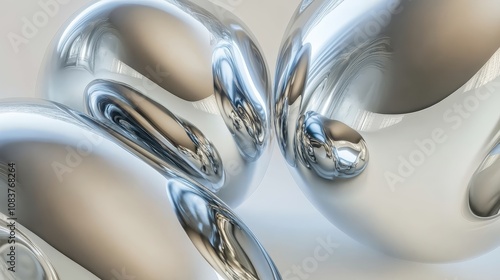 Abstract Composition of Polished Metallic Spheres Reflecting Light and Shadows in a Minimalist Setting, Showcasing Smooth Curves and Shiny Surfaces for Artistic Backgrounds
