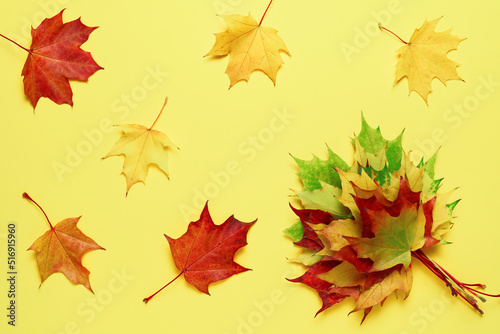 Abstract composition with autumn falling leaves and bunch of maple leaves on yellow background. Autumn mood.