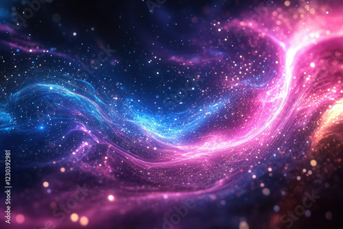 Abstract cosmic artwork depicting swirling nebulae with vibrant pink and blue hues, glittering with stardust.
