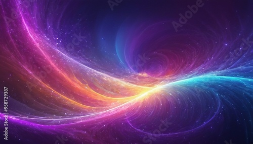 Abstract cosmic background with swirling purple, blue and yellow lights and stars.