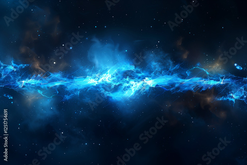 Abstract cosmic nebula with bright blue energy flow across dark starry night sky background