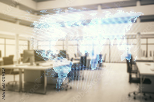 Abstract creative world map interface on a modern furnished office background, international trading concept. Multiexposure