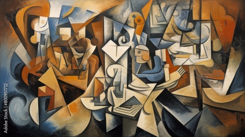 Abstract Cubist Painting with Geometric Shapes and Vibrant Colors