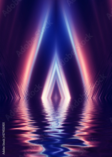 Abstract dark futuristic background. Neon rays of light are reflected from the water. Background of empty stage show, beach party. 3d illustration
