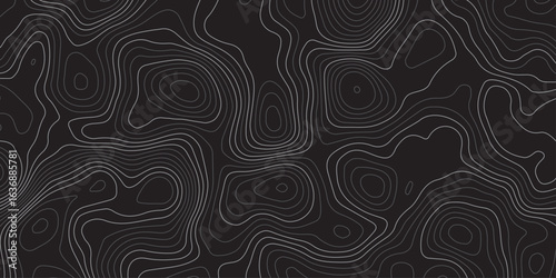 Abstract dark topographic map background with smooth contour lines, modern minimalistic design, seamless pattern, perfect for wallpapers, presentations, and geolocation-themed projects.