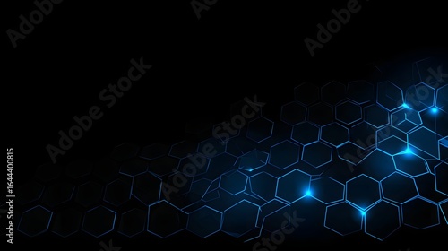 Abstract design of interconnected hexagons in a dark background with glowing blue lines.