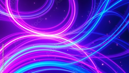 Abstract design with vibrant swirling neon lines and glowing particles.