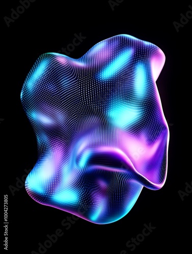 Abstract digital artwork featuring a vibrant, colorful, and fluid shape against a black background. A minimalist poster in metallic and chrome gradient style.